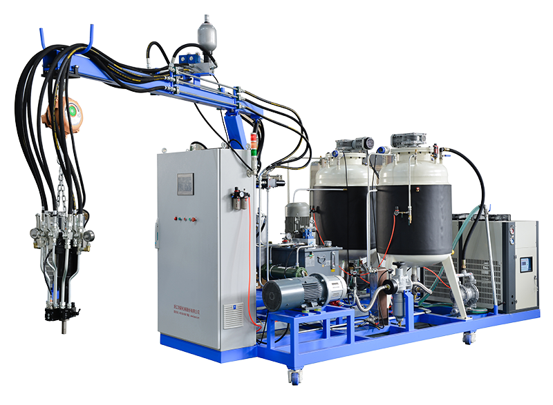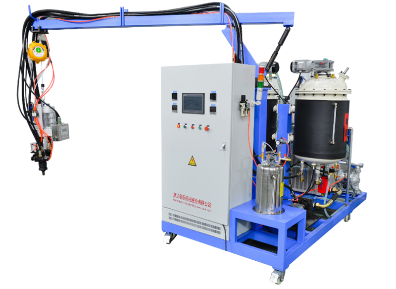 聚氨酯低壓發(fā)泡機功能和高壓發(fā)泡機相同,通過兩臺高精度齒輪計量泵送至混合槍頭,經(jīng)過攪拌葉高速攪拌而達到均勻的混合效果,注入模具中生產(chǎn)所需要的制品。澆注完畢后需用二氯甲烷進行清洗。